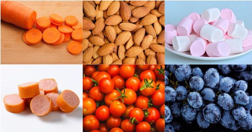 Choking hazards: Small, hard, rounded foods such as whole nuts, seeds, grapes, raw carrots, and pieces of apple can present choking hazards for young children. These foods can be offered to infants over 6 months old if cooked or prepared appropriately, such as cooking, grating, pureeing, or offering nuts and seeds as smooth butters.